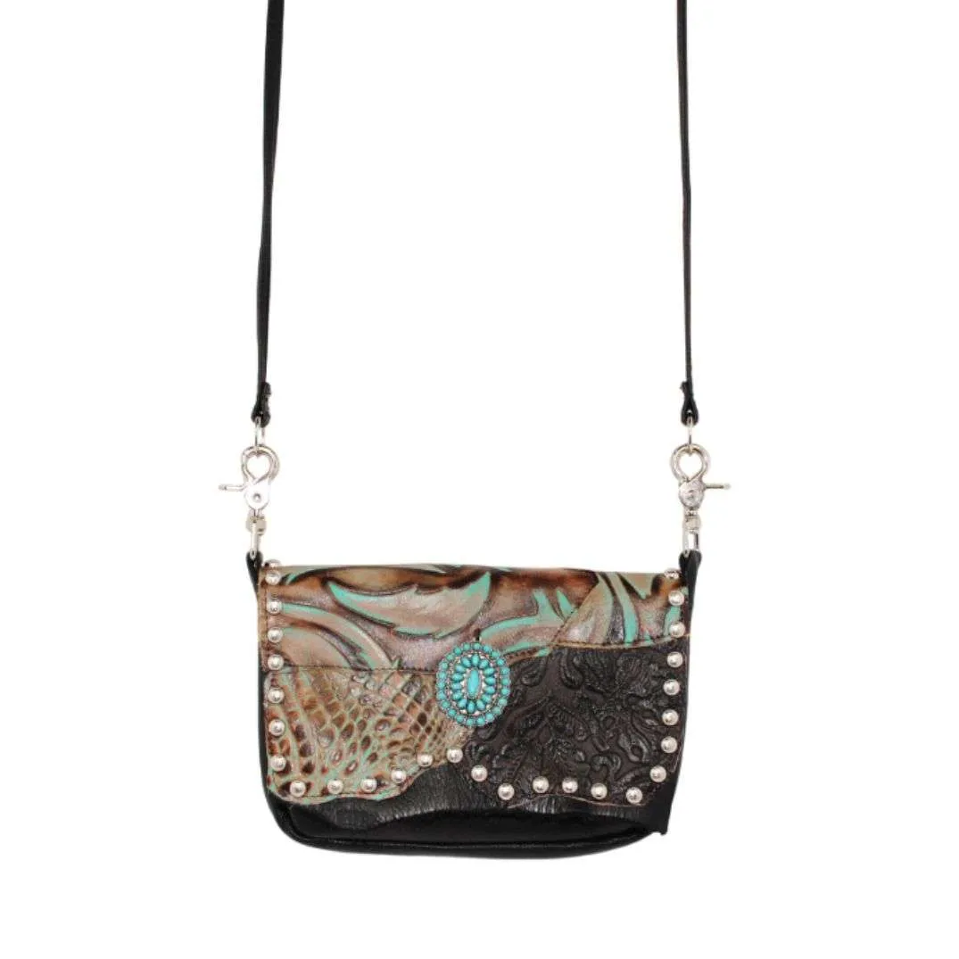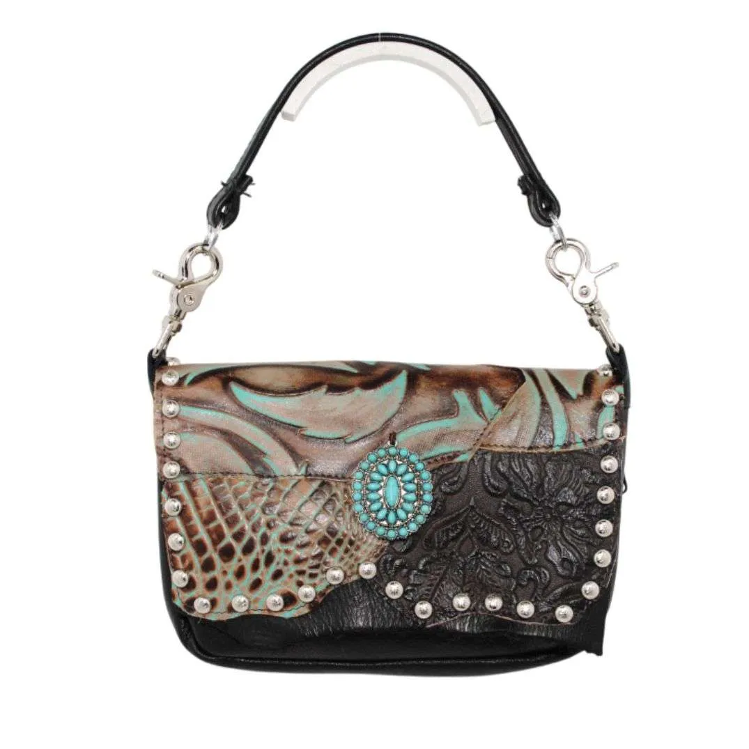 The XL Concealed Carry Hip Bag combines style, function, and security in one sleek design. Crafted from high-quality black leather, this bag features a stunning brown oak leaf design and turquoise gator swirl print on the lid, accented by a luxurious oval silver shield centerpiece with turquoise stones. Perfectly sized to accommodate full-frame handguns like the Glock 17 or SIG Sauer P226, it offers ample space for carrying your firearm, extra magazines, wallet, phone, and more, all without compromising on style. The bag includes a discreet, ambidextrous rear concealed carry pocket, a magnetic snap closure, and an interior credit card/ID pocket for easy access. With an adjustable strap for versatile wear, whether around the waist or crossbody, this lightweight and functional bag ensures you’re always prepared in a fashionable, discreet manner.