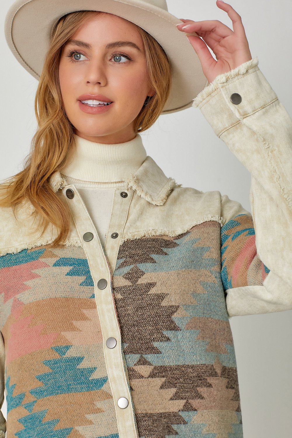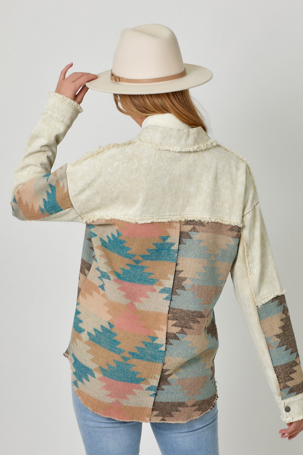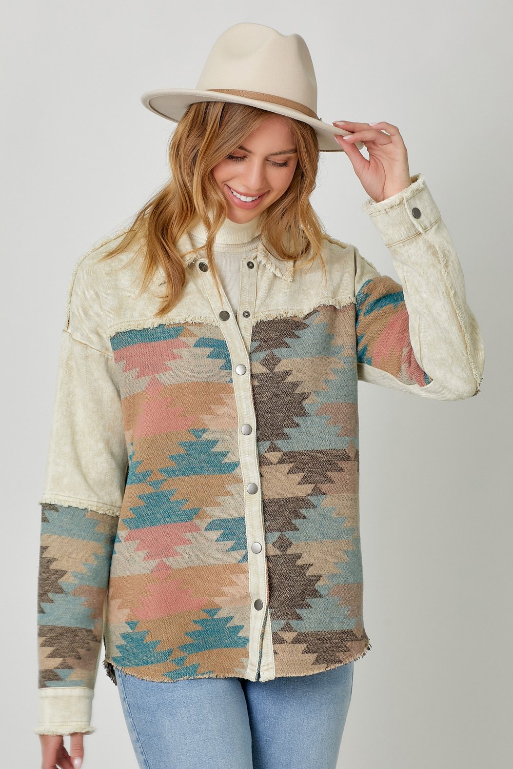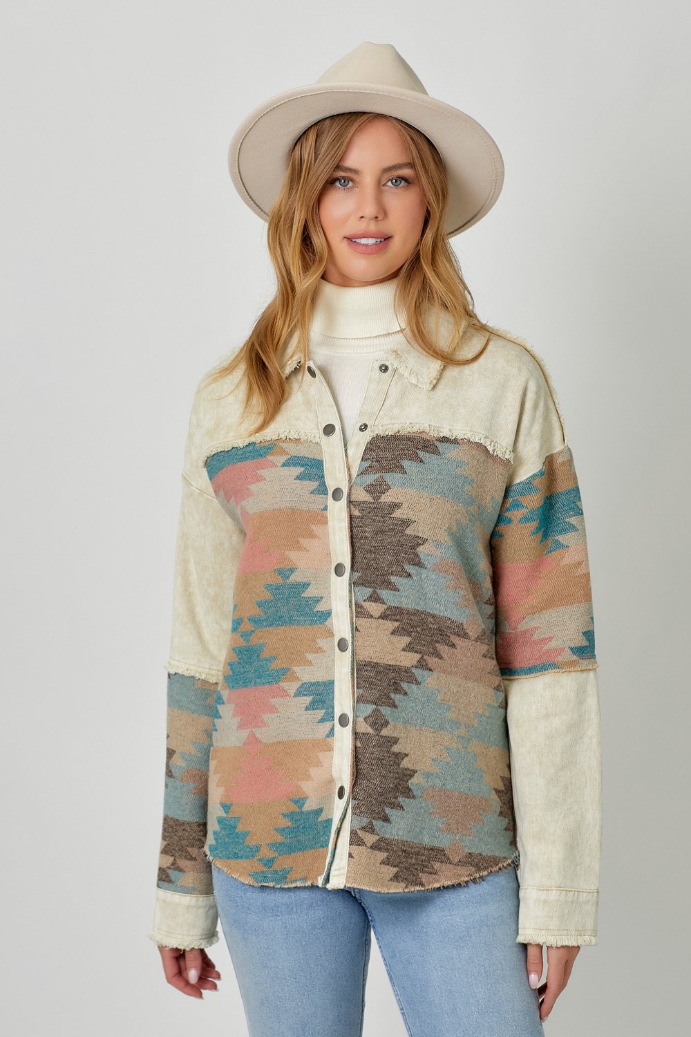 The Mystree Aztec Print Mixed Jacket in Butter Mix is a stylish and versatile piece that combines comfort and fashion effortlessly. Featuring a bold Aztec print with fringe detailing, this jacket adds a unique touch to your wardrobe. The button-down closure, hi-lo hem, and color block print provide a modern and flattering silhouette, perfect for layering over your favorite outfits. Made from a durable blend of 95% polyester and 5% wool for the shell, and 100% cotton for the contrast fabric, this jacket is both comfortable and long-lasting. Available in sizes Small, Medium, and Large, the Butter Mix color offers easy pairing with a variety of looks, making it an essential addition to any fashion-forward collection.
