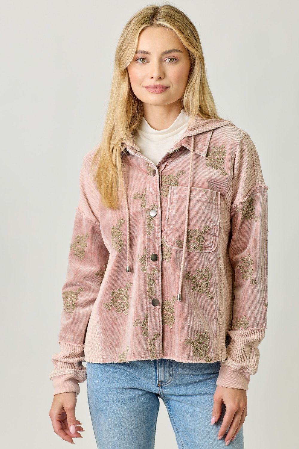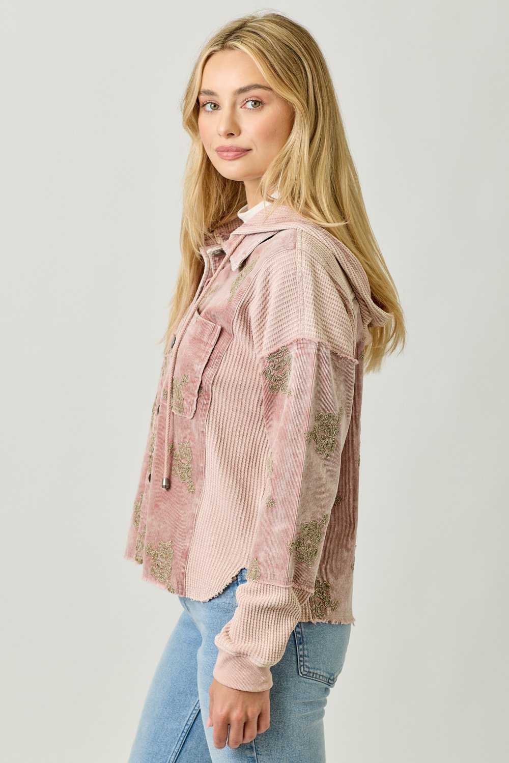 The Mystree Washed Rose Floral Embroidery Hoodie Jacket combines style and comfort effortlessly. This jacket features a beautiful flower embroidery design that adds a feminine touch to your outfit. With a removable hood, button-down front, and a functional chest pocket, it offers both versatility and practicality. The hi-lo hem gives the jacket a flattering silhouette, making it perfect for layering or wearing on its own. Available in sizes S, M, and L, this jacket comes in a soft Washed Rose color, ideal for pairing with a variety of casual looks. Whether you’re running errands or enjoying a laid-back outing, this hoodie jacket is a must-have for your wardrobe.