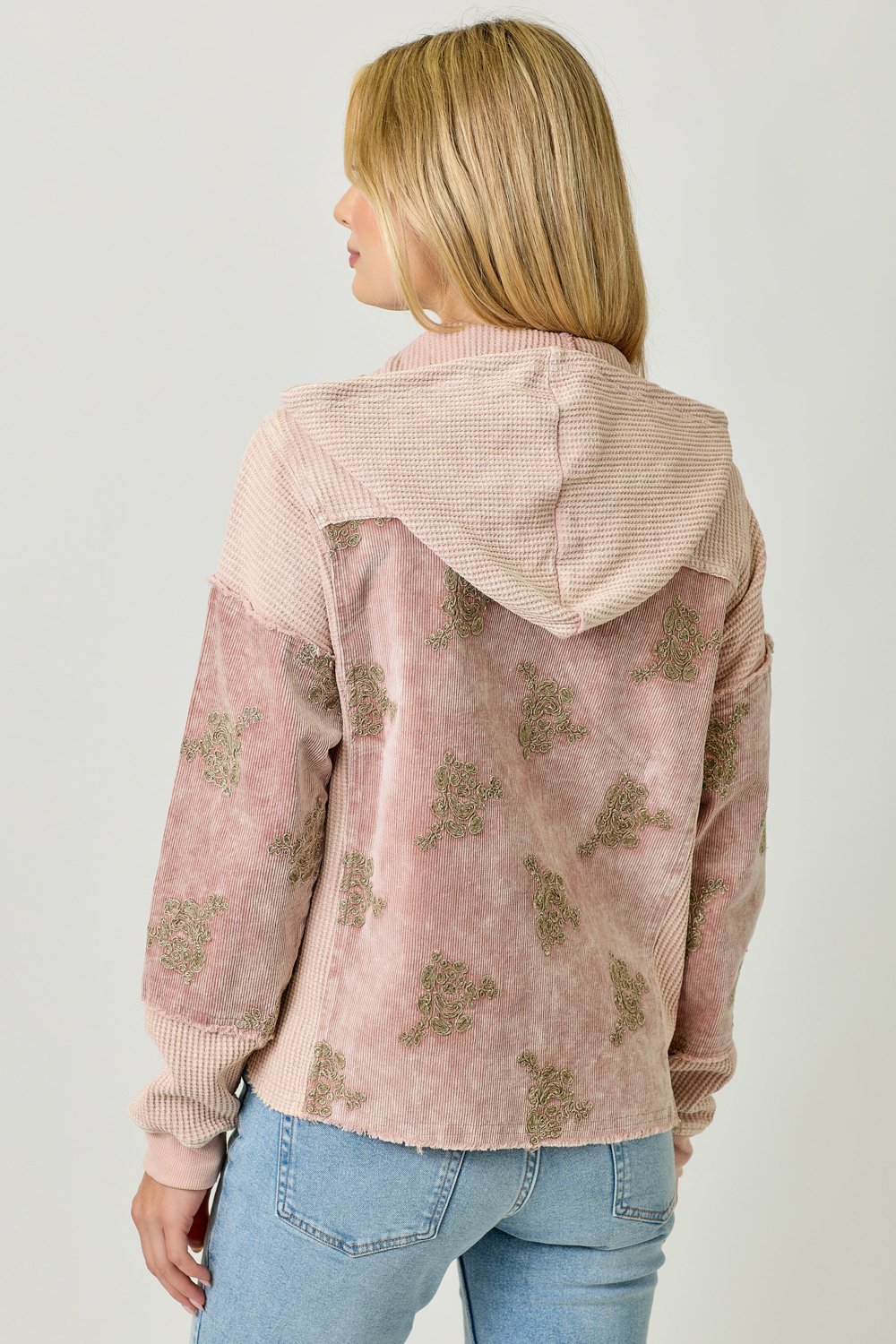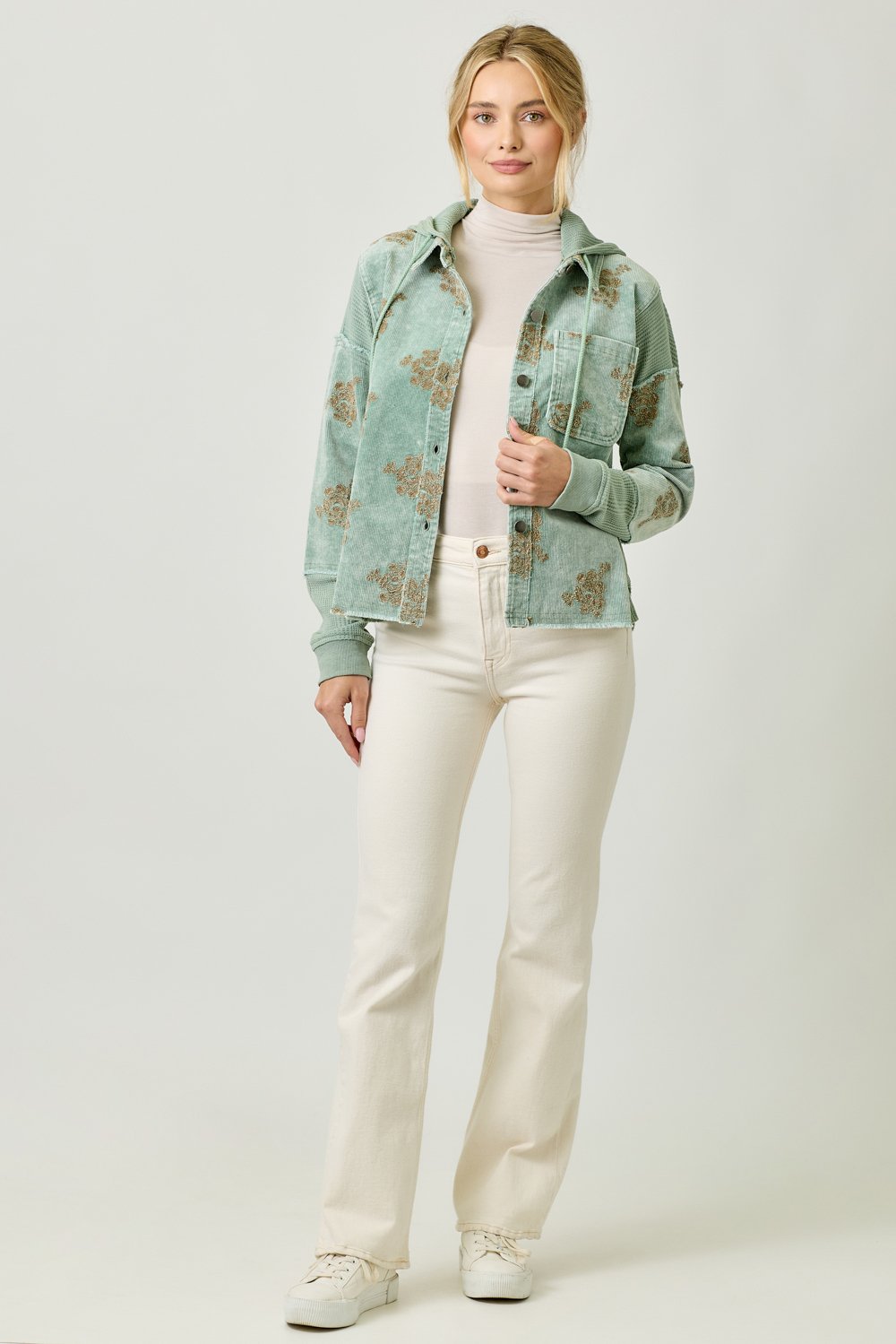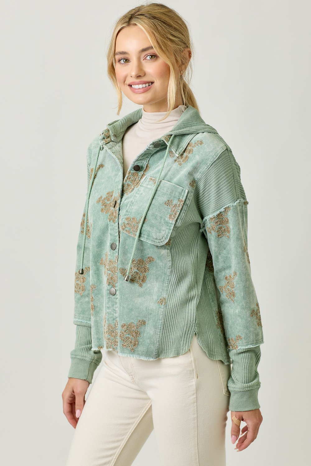 The Mystree Washed Seafoam Floral Embroidery Hoodie Jacket combines style and comfort effortlessly. This jacket features a beautiful flower embroidery design that adds a feminine touch to your outfit. With a removable hood, button-down front, and a functional chest pocket, it offers both versatility and practicality. The hi-lo hem gives the jacket a flattering silhouette, making it perfect for layering or wearing on its own. Available in sizes S, M, and L, this jacket comes in a soft Washed Seafoam color, ideal for pairing with a variety of casual looks. Whether you’re running errands or enjoying a laid-back outing, this hoodie jacket is a must-have for your wardrobe.