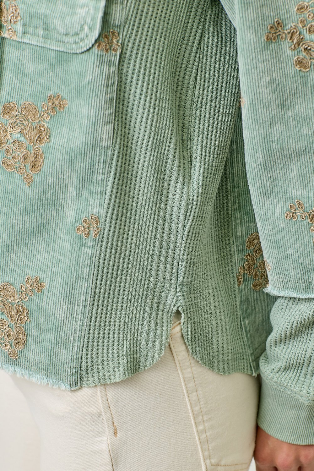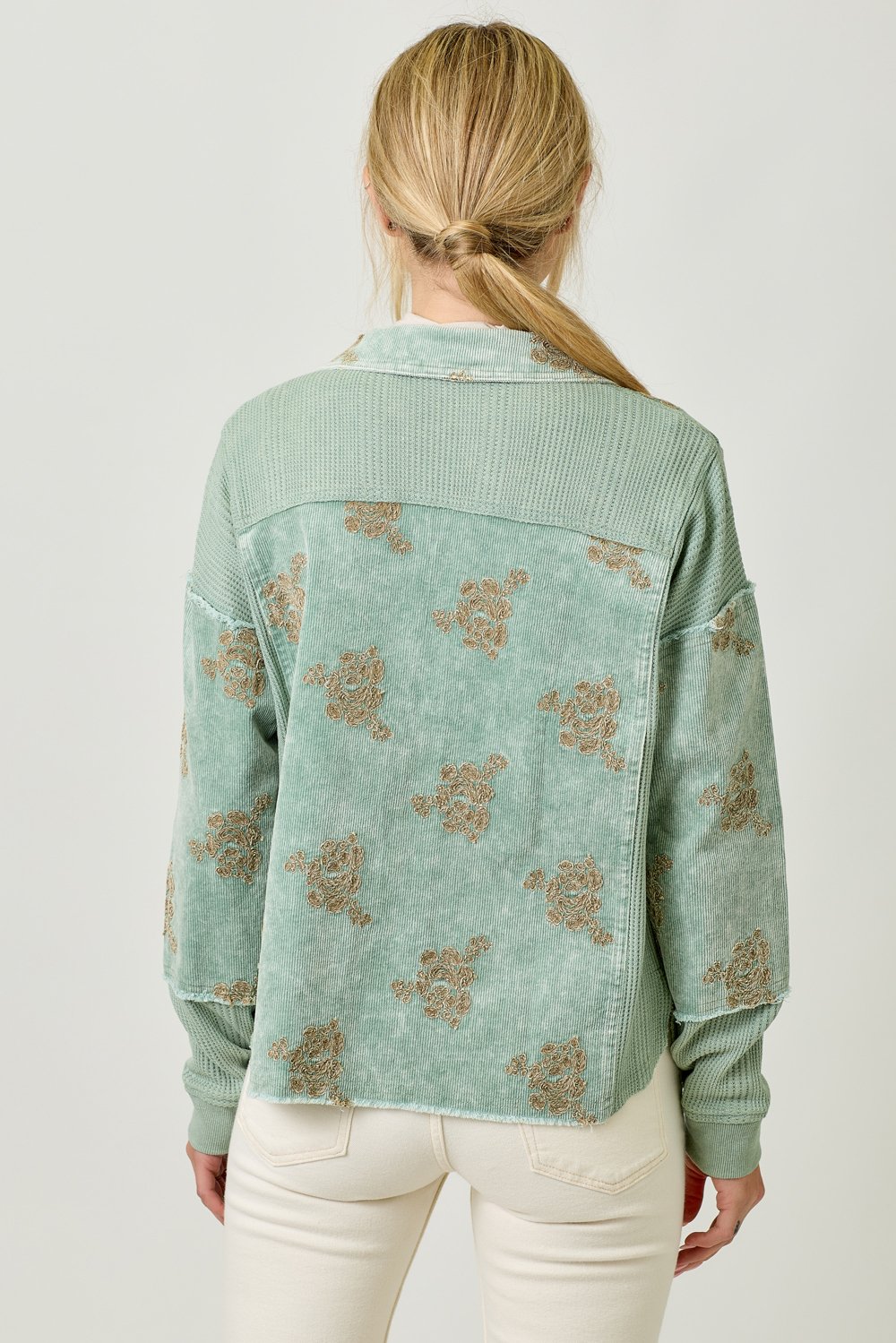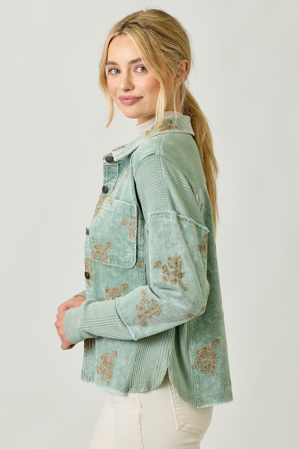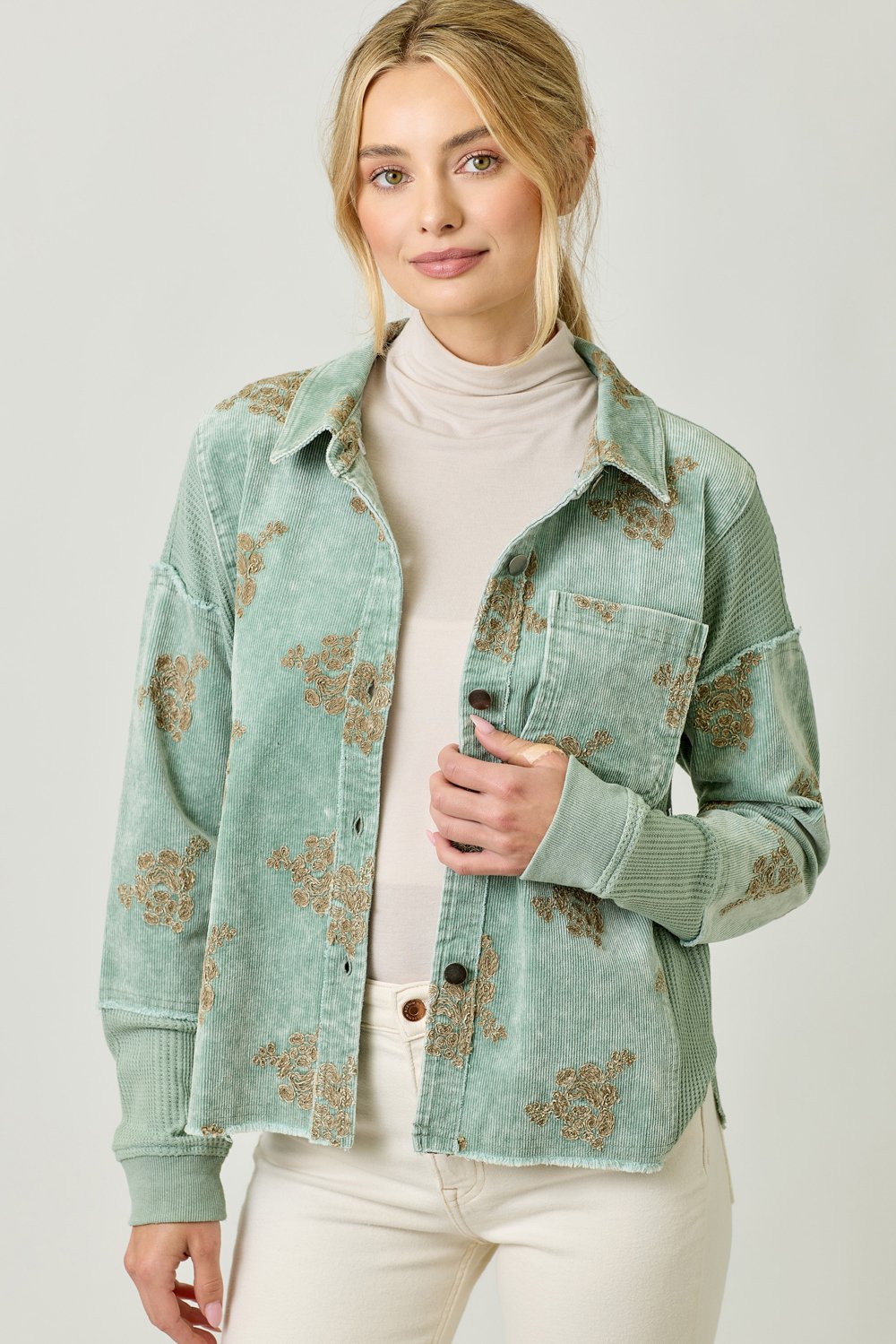 The Mystree Washed Seafoam Floral Embroidery Hoodie Jacket combines style and comfort effortlessly. This jacket features a beautiful flower embroidery design that adds a feminine touch to your outfit. With a removable hood, button-down front, and a functional chest pocket, it offers both versatility and practicality. The hi-lo hem gives the jacket a flattering silhouette, making it perfect for layering or wearing on its own. Available in sizes S, M, and L, this jacket comes in a soft Washed Seafoam color, ideal for pairing with a variety of casual looks. Whether you’re running errands or enjoying a laid-back outing, this hoodie jacket is a must-have for your wardrobe.