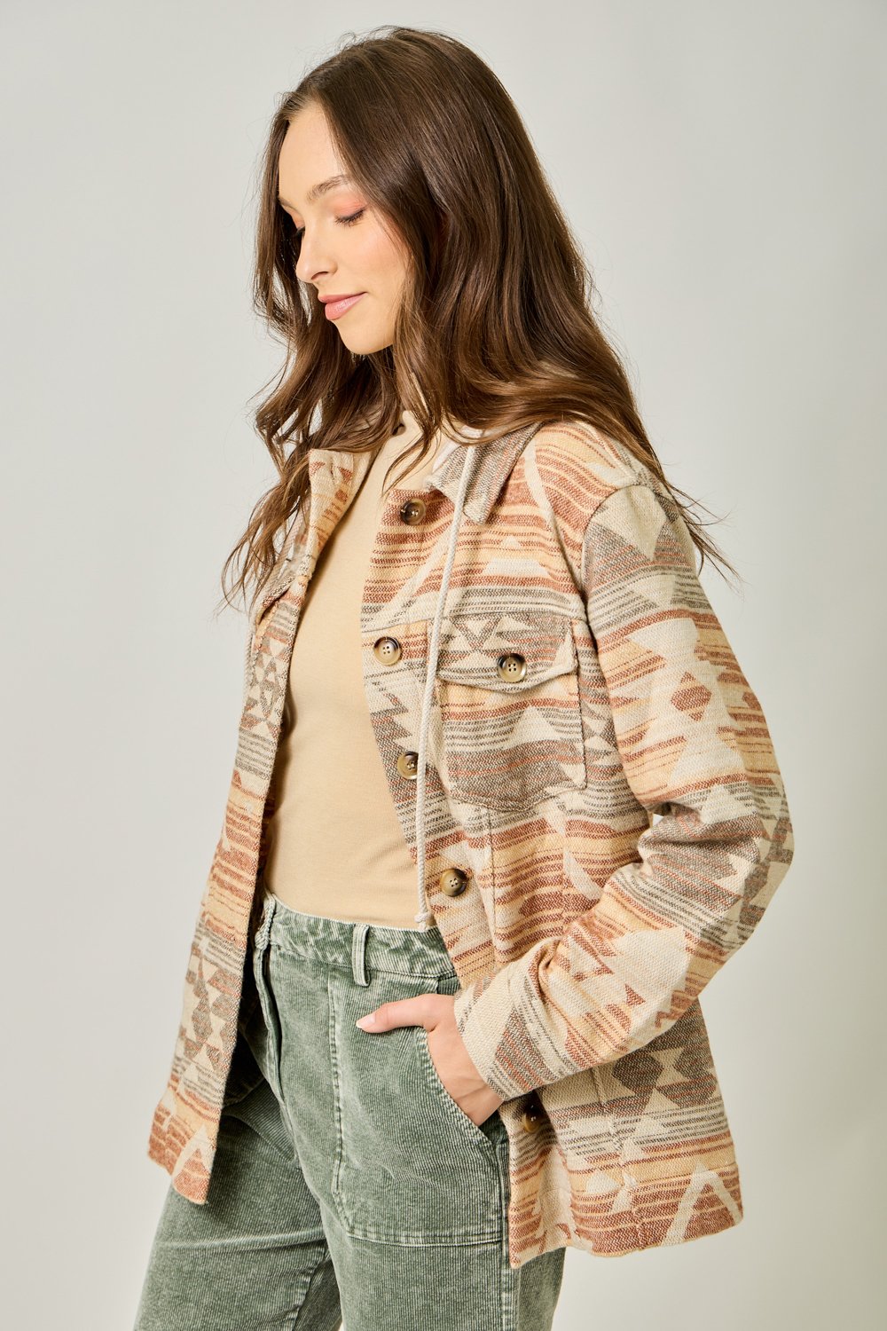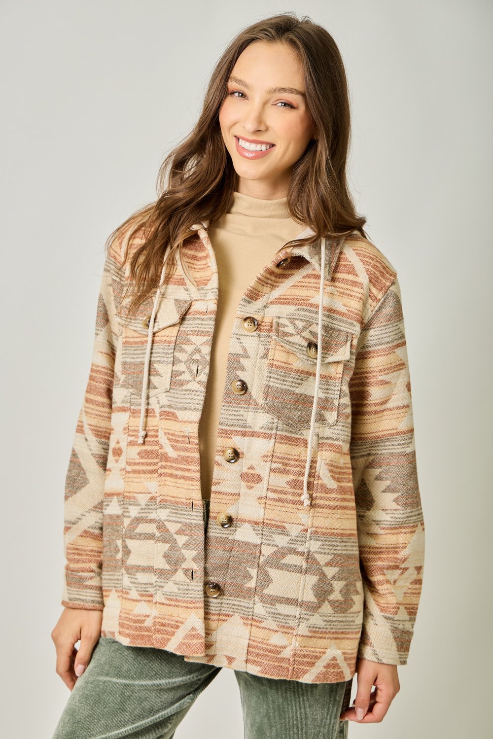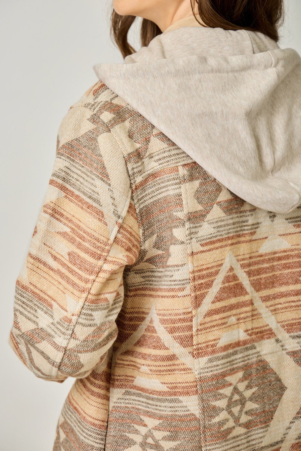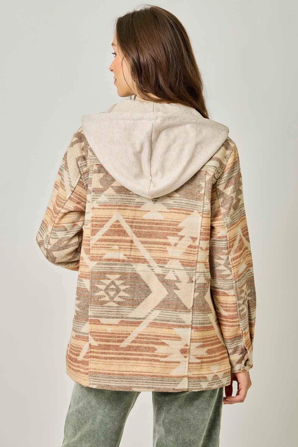 The Mystree Hoodie Aztec Jacket in Desert Sand Mix combines style and comfort effortlessly. Featuring a unique Aztec pattern, this jacket is designed with a drawstring hoodie for a customizable fit, and a button-down front for easy wear. Functional chest and side pockets add practicality, while long sleeves provide added warmth and comfort. Made from a soft blend of 95% polyester and 5% wool, with a durable contrast fabric of 73% polyester and 27% cotton, it offers the perfect balance of coziness and durability. The versatile desert sand mix color pairs well with any outfit, making it an essential piece for every wardrobe. Available in Small, Medium, and Large sizes, it’s the perfect addition to your casual chic collection.