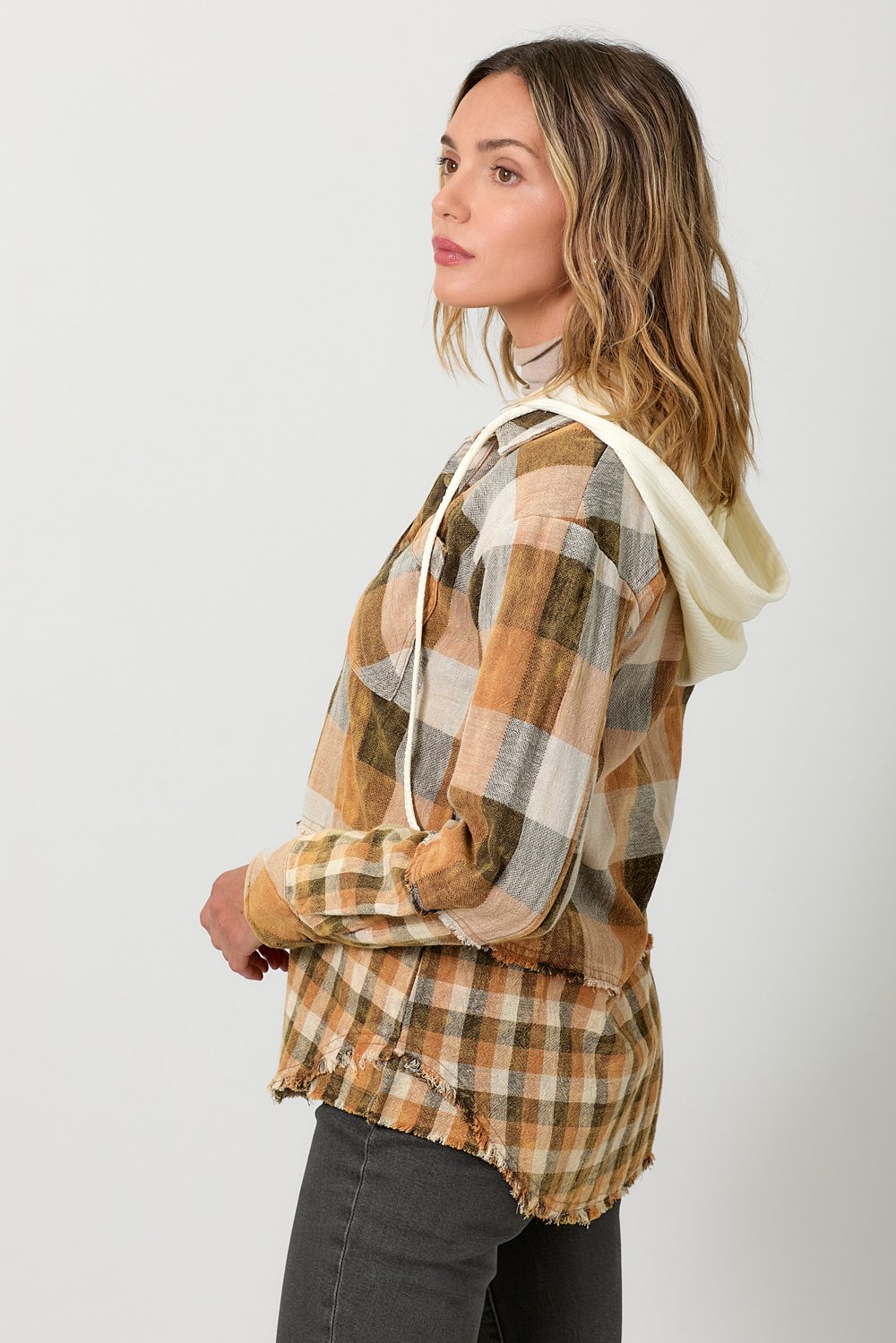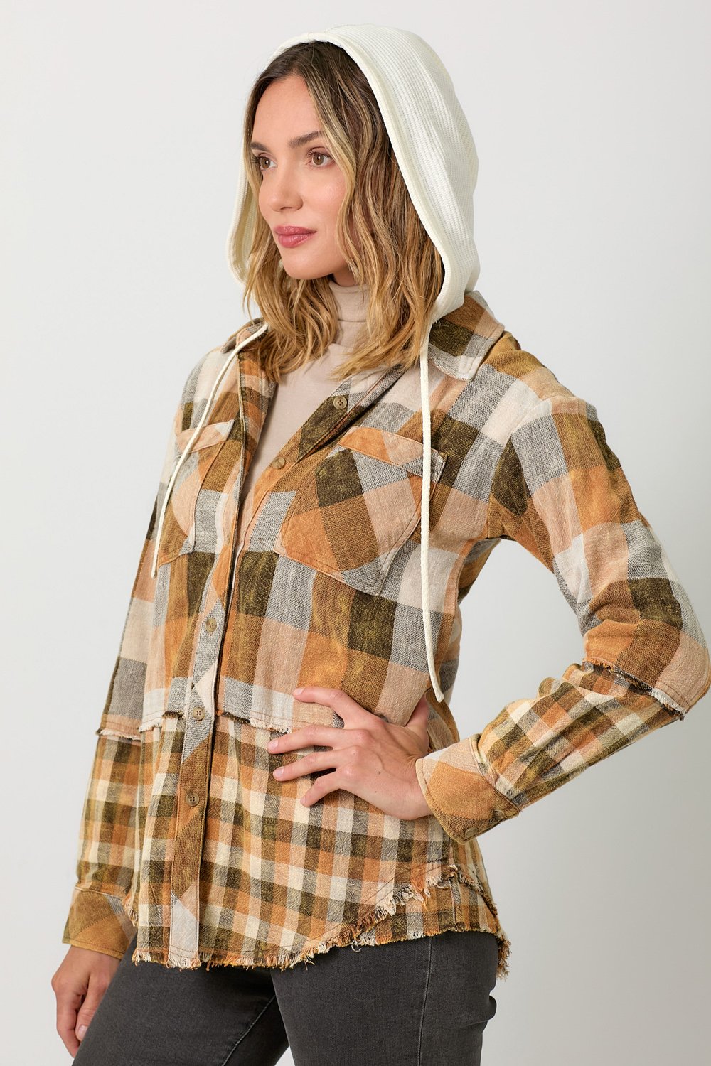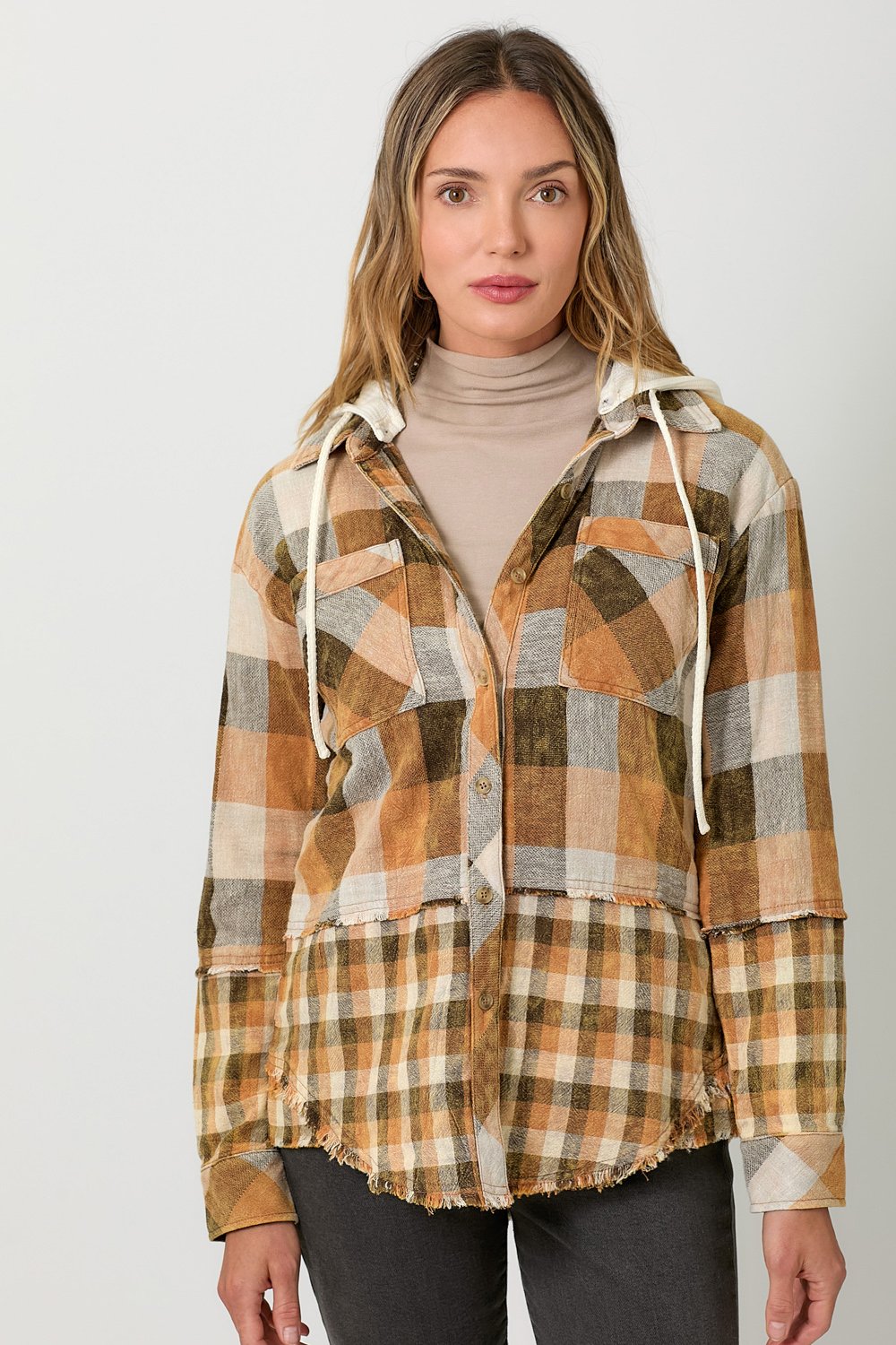 The Mystree Hoodie Check Jacket in Pumpkin Mix combines style and comfort in one chic piece. Featuring a trendy checkered pattern, this jacket boasts a removable hood with a drawstring for a customizable fit. The functional bust pockets add practicality, while the fringed hi-lo hem brings a modern and edgy touch. Made from a blend of 100% cotton and a polyester-rayon-spandex mix, the jacket is both soft and breathable. Perfect for layering, this versatile jacket comes in a warm Pumpkin Mix color and is available in sizes Small, Medium, and Large, offering a flattering fit for all body types.